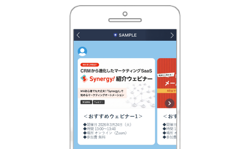 | 顧客データとLINE情報の紐付け(コネクト) | LINE公式アカウントの友だちをSynergy!(シナジー)の顧客情報と紐付けることができます。友だちがコネクト用フォームへ登録することで、Synergy!(シナジー)からLINEメッセージを配信できるようになります。 |